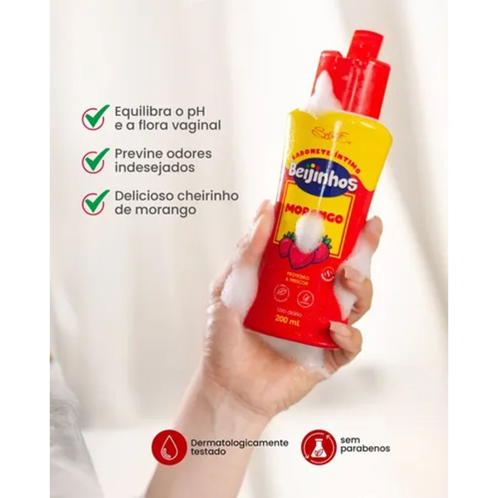 Desfrute de frescor e proteção com o Sabonete Íntimo Beijinhos Morango, ideal para a saúde íntima feminina.